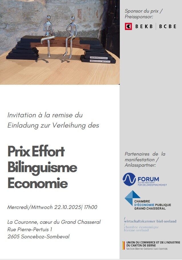 18h15 Remise du Prix Effort Bilinguisme Economie par Denis Moret, responsable de la zone d’activité Seeland, Jura bernois et Soleure de la BCBE /